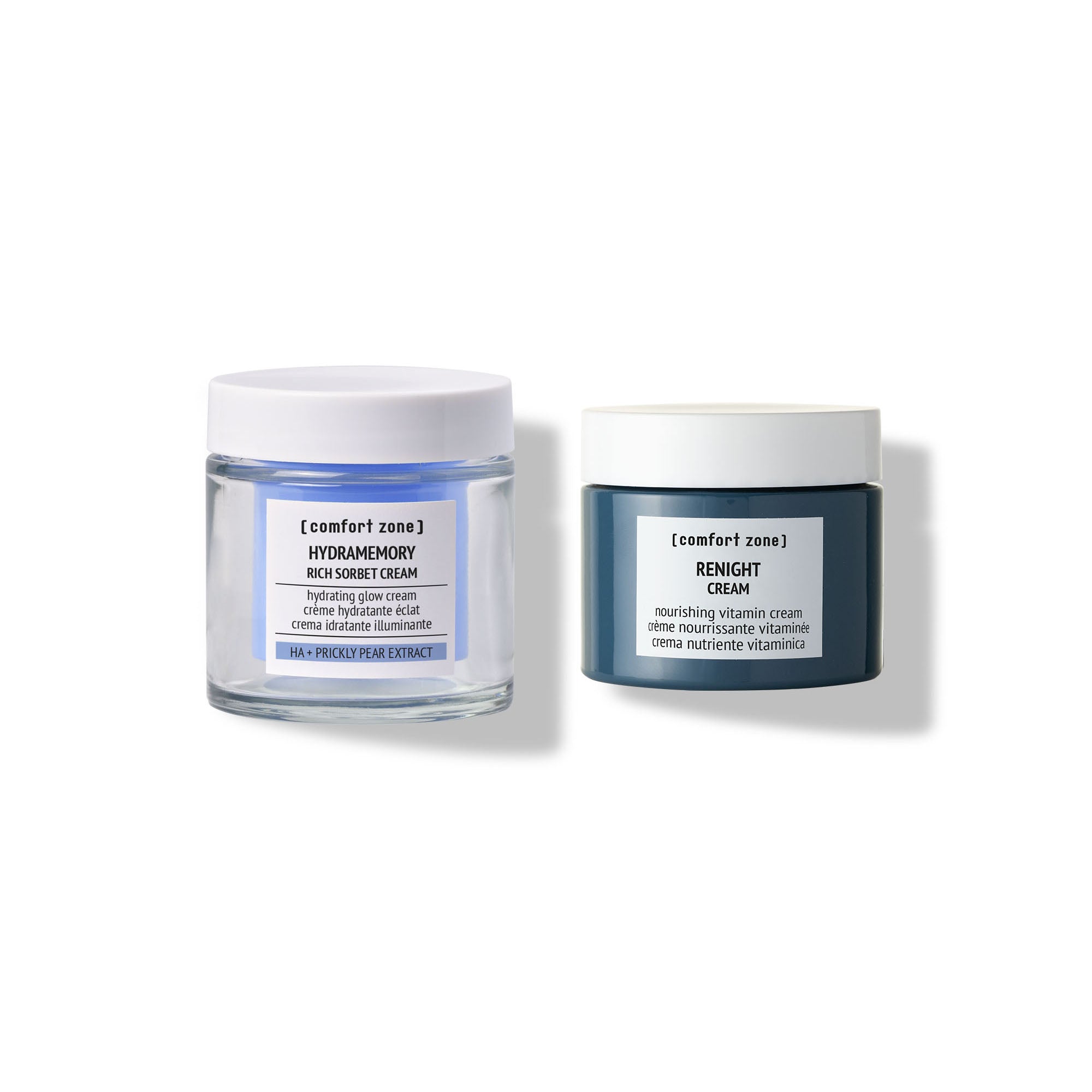 Set voor een diepe hydratatie gedurende de dag. Bevat: Hydramemory Rich Sorbet Cream 50ml voor onmiddellijke en langdurige hydratatie en glans die comfort en intense hydratatie geeft aan de huid, die onmiddellijk zachter, gladder en stralender is. Renight Cream 60ml Nachtcrème met voedende en vitaminewerking, ideaal als nachtelijke cosmetische behandeling. Gezichtscrème geformuleerd met gecertificeerde organische Goji bessenolie en gehydrolyseerd tomatenextract is ideaal als crème voor de droge huid die meer voeding nodig heeft.