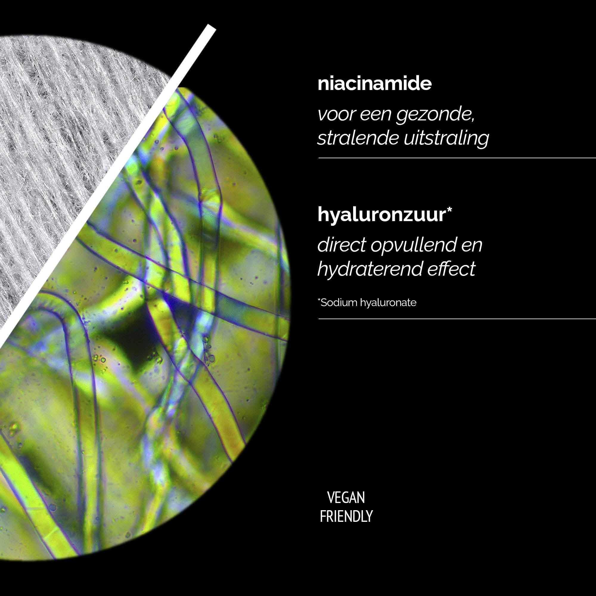 Dankzij de freeze-dried technologie bevat dit masker een hoge concentratie actieve ingrediënten, die hierdoor beter behouden blijven en effectiever werken dan ooit. De hightech vezels, verrijkt met niacinamide, hyaluronzuur** (sodium hyaluronate), panthenol en plantaardige extracten, worden pas geactiveerd op het moment van gebruik met water—een zintuiglijke beleving die je routine omtovert tot een unieke, luxe en persoonlijke ervaring.